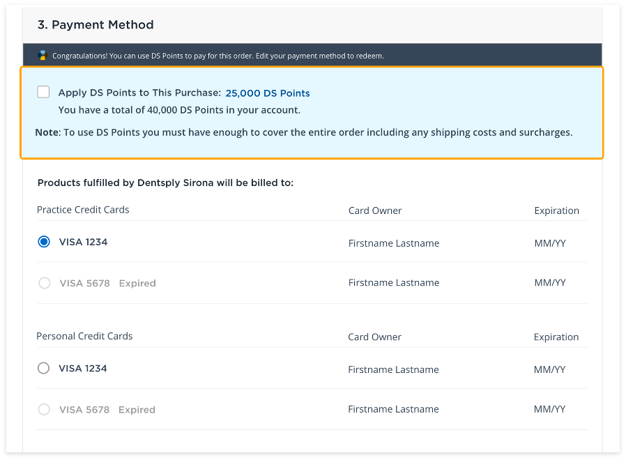 1. During Checkout, select Edit in the Payment Method panel. If you have enough DS Points for your entire purchase, you’ll see a checkbox with the option to use your points. Select the checkbox to redeem your DS Points.