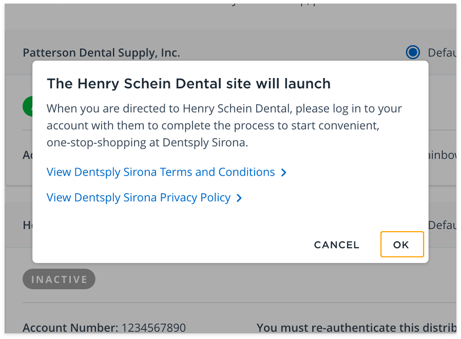 5. Select Submit to open the distributor’s website in a new window. You’ll need to enter your credentials for the distributor’s website to connect that account to your DentsplySirona.com account You must have a valid distributor web account to login. If you do not have an existing distributor web account, register on the distributor’s website If you experience issues during this process, please reach out to your distributor’s customer service department