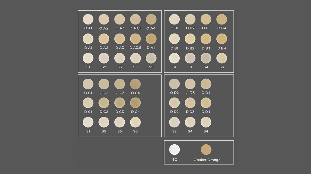 Die Opalschneiden 1 und 2 sind für hellere (OS 1) und dunklere (OS 2) Farbtöne vorgesehen. Für Zwischentönen werden die beiden Massen einfach im Verhältnis 1:1 gemischt. Das gleiche Prinzip gilt für Flu Inside 1 und 2. Diese hochfluoreszierenden Massen sind für den inneren Schichtaufbau bestimmt und decken den Liner auch bei beengten Platzverhältnissen ab, während sie gleichzeitig die Helligkeit im Inzisalbereich erhöhen.