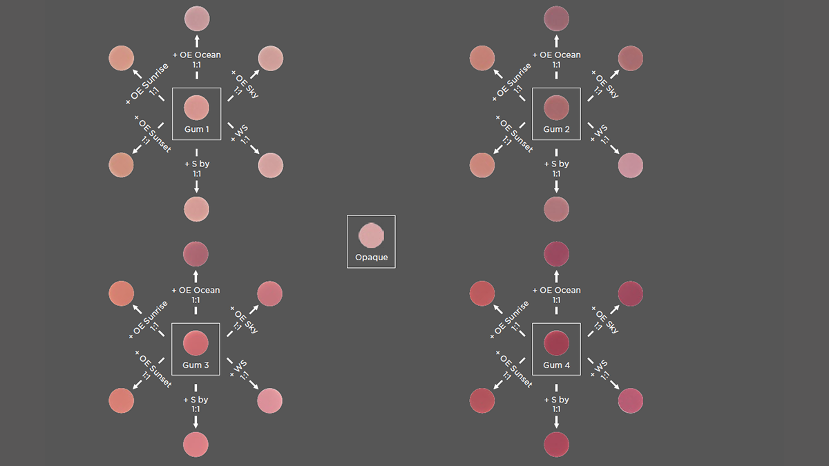 Durch Mischen der Zahnfleischmasse Gum 1 bis 4 mit extra ausgewählten Effektmassen (siehe Grafik) lassen sich auf einfachste Weise naturidentische Zahnfleischcharakteristika reproduzieren.