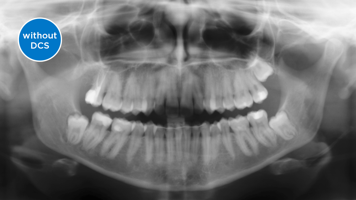 Die folgende Abbildung zeigt eine Panorama-Röntgenaufnahme ohne und mit DCS-Technologie. Bewegen Sie den Schieber über das Röntgenbild und entdecken Sie selbst, welchen Unterschied der DCS-Sensor bei der Bildqualität macht.