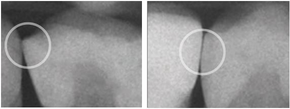 Schlechte Kontaktpunkte wie im linken Bild zu sehen können zu Frakturen, Einbeißung von Speiseresten, Zahnfleischentzündungen und Sekundärkaries führen.1 Ein korrekt ausgeformter Kontakt ist breit, konvex und die Kontaktfläche stellt sich im mittleren Drittel des Zahns dar, wie im rechten Bild gezeigt.