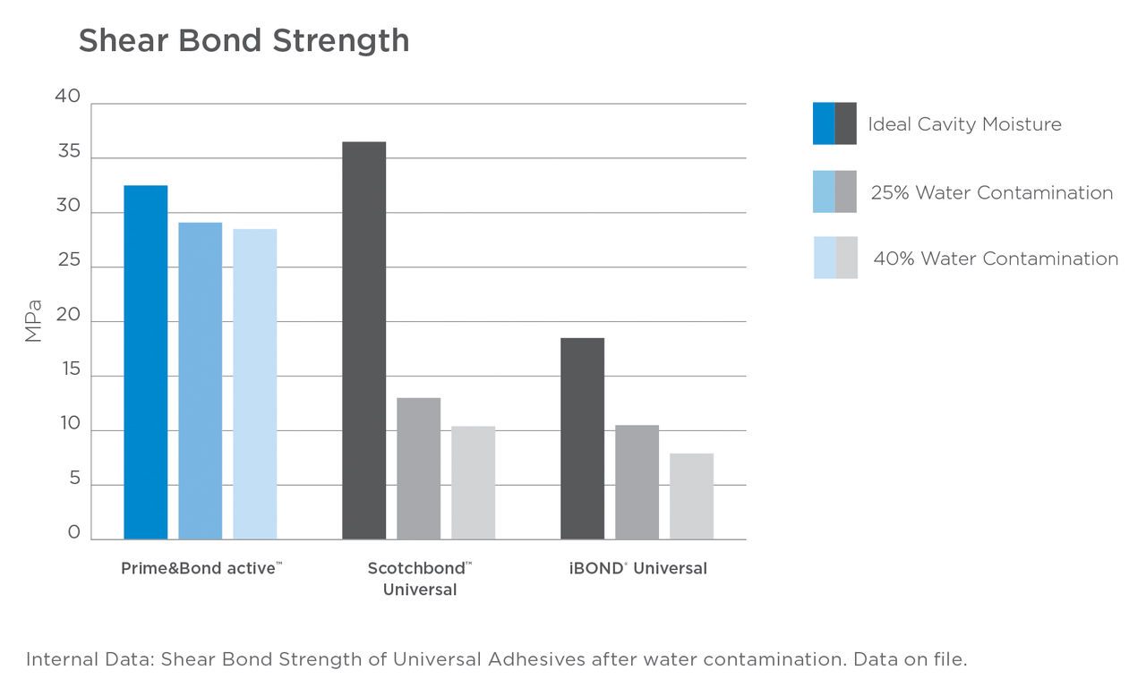 Prime&Bond active stellt die patentierte Active-Guard-Technologie vor. Unsere Formulierung bietet ein ausgewogenes Verhältnis aus hydrophoben und hydrophilen Eigenschaften, um eine vollständige Benetzung und Penetration selbst bei unterschiedlichen Feuchtigkeitsgraden zu gewährleisten. Selbst wenn Dentin zu feucht oder zu trocken ist, erhalten Sie einen zuverlässigen Haftverbund, der aktiv vor den Hauptursachen von adhäsivem Versagen schützt.