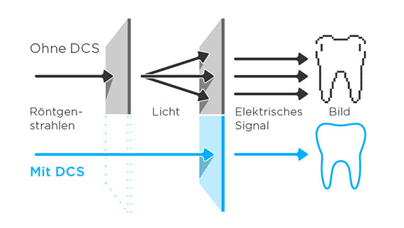 Der Direct Conversion Sensor (DCS) hat den Standard der Panorama-Bildgebung neu definiert. Röntgenstrahlen werden direkt in elektrische Signale umgewandelt – im Gegensatz zu herkömmlichen Systemen gibt es keinen Signalverlust durch Lichtumwandlung, was eine verbesserte Bildgebung ermöglicht. Das Ergebnis sind Bilder mit einer sehr hohen Schärfe, selbst bei niedriger Dosis.