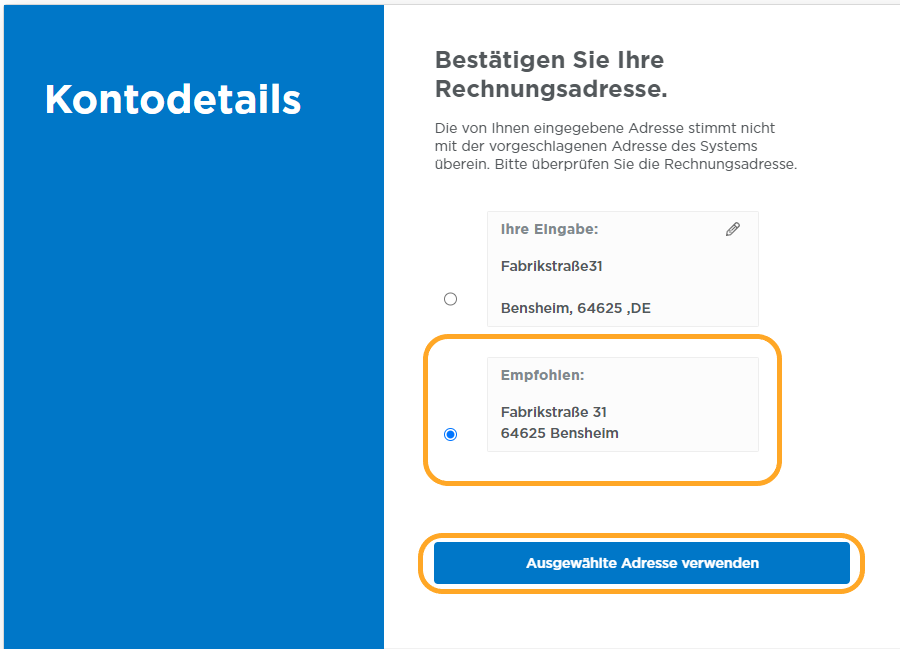 7. Wählen Sie die Rechnungsadresse Ihrer Praxis aus und wählen Sie dann Ausgewählte Adresse verwenden
