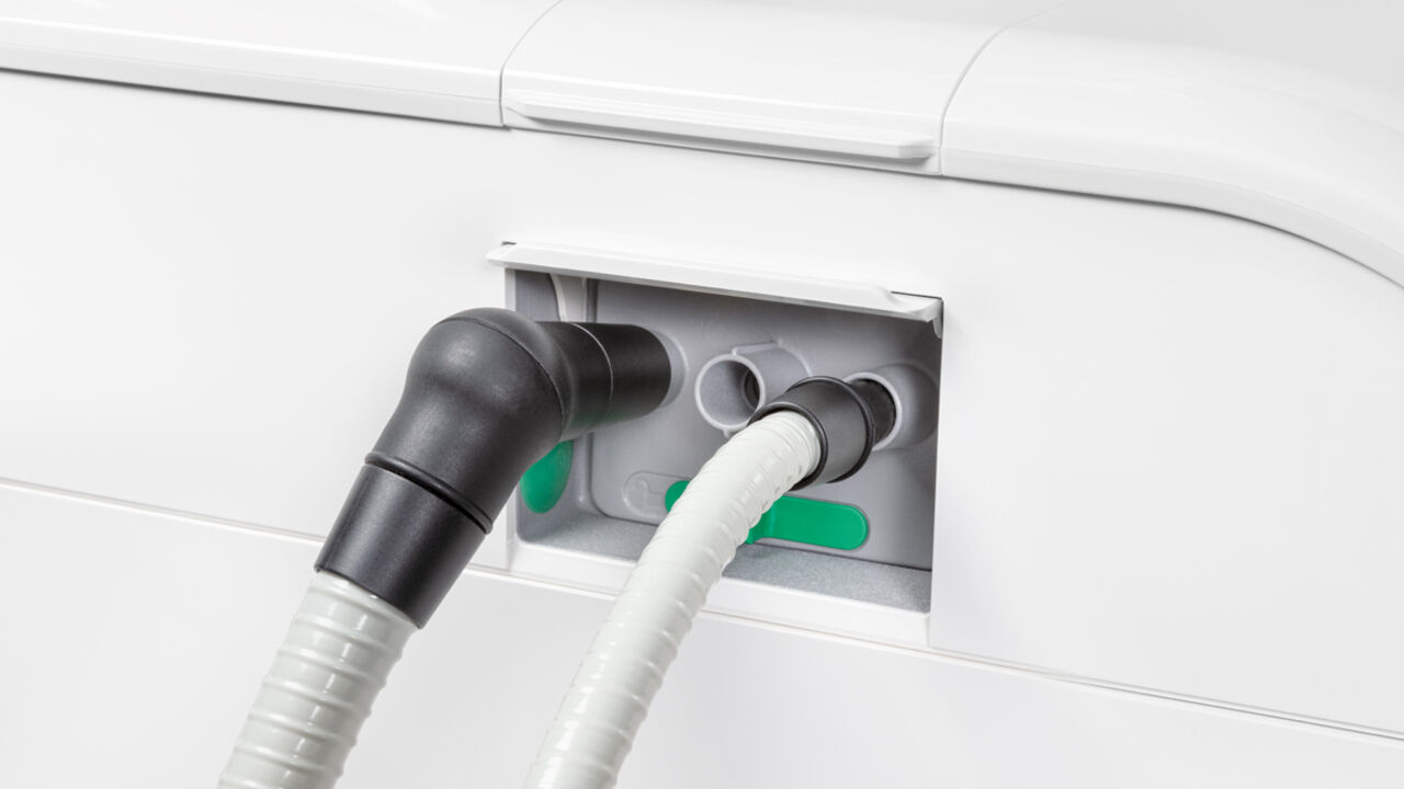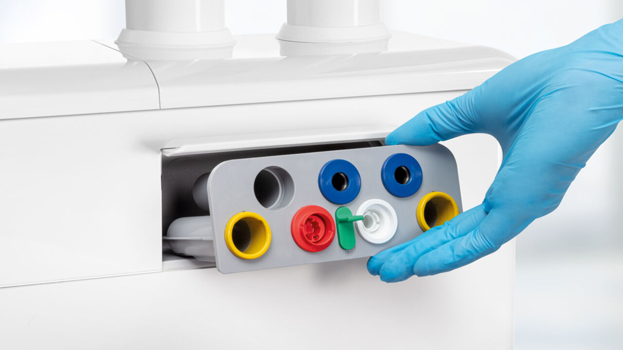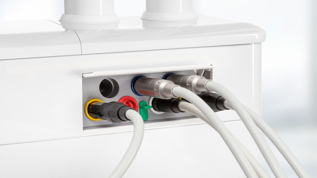Mit den integrierten und herausnehmbaren Sanieradaptern ist eine einfache und zuverlässige Reinigung und Desinfektion der Instrumentenschläuche mit Hilfe der integrierten Desinfektionsanlage sichergestellt.