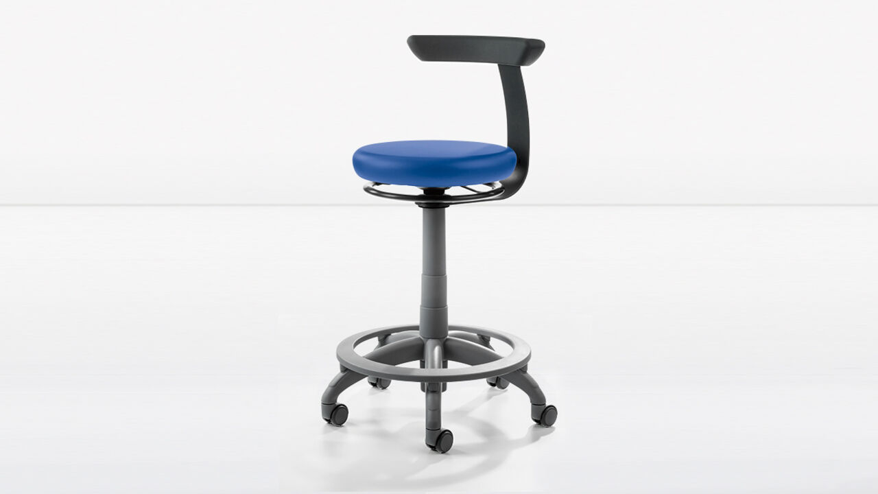 Carl Manual Plus I, Sitzhöhenverstellung per Hand, mit Fußring. Die runde Sitzfläche mit komfortabler Polsterung ist „nahtlos“ hygienisch.