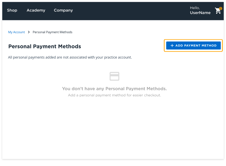 Your personal payment method can be used to make purchases for any practice your login credentials are tied to. To add a new credit card to your payment options, follow these directions: