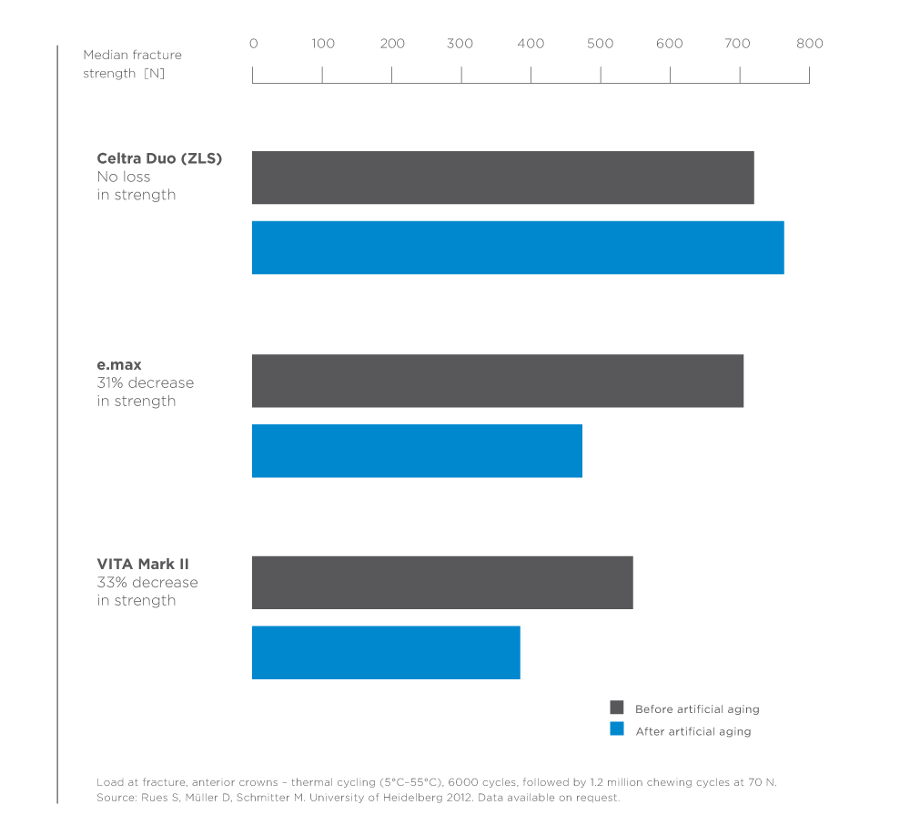 Even after 6,000 thermal cycles (41°F to 131°F) and 1.2 million chewing cycles with 70 Newtons of force, Celtra Duo demonstrated no loss in strength.