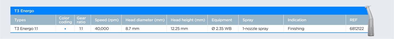 Discover T3 Energo from Dentsply Sirona - a robust series of electric handpieces in the economy class that combines quality and expertise. The ISO interface allows you to remain flexible. The handpieces in the T3 class impress with their “Made in Germany” quality, optimised gear design and Safe Head Technology1. Durability and ergonomics are supported by the 4*2 nozzle spray system.