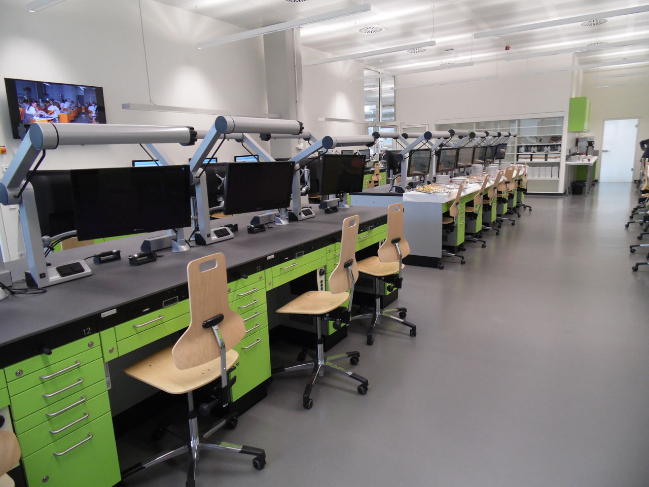 To teach the students how to work with a microscope, the Simulation Units were equipped with 17 OPMI Pico microscopes by Zeiss. For a cost-efficient solution, the 16 microscopes for students were mounted on flexible arms, making one microscope accessible from three workplaces. The 17th microscope was combined into the master simulation unit.