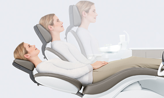 In addition, the headrest inclination is stored with the dental chair programs for easy recall of e.g. maxillar or mandibular treatment positions.