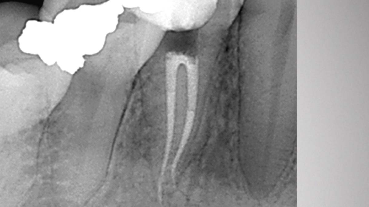 On the left: Using different formulations of gutta-percha in one case can cause varying degrees of opacity.