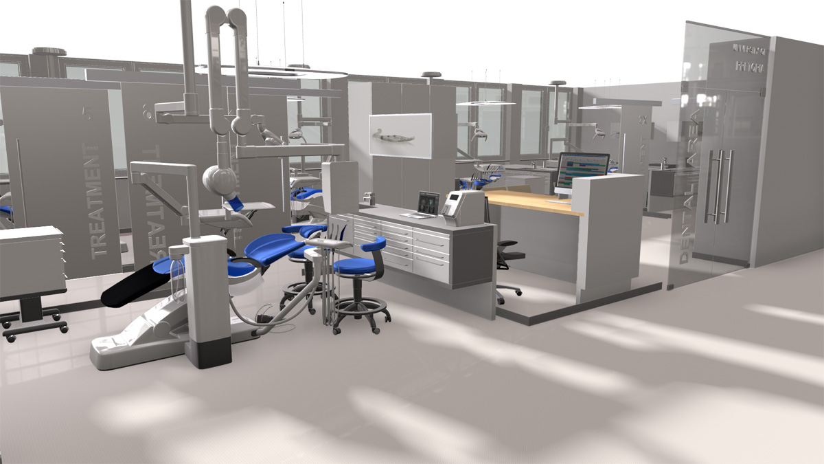 The realistic visualisation of a project makes the construction process more coordinated and precise. There are various ways to graphically represent your ideas. Classic two-dimensional floor plans continue to be the indispensable basis for precise planning, for both architects and building technicians. However, actual users often find it difficult to imagine their daily working environment and work processes just from these black lines on white paper. The team of experts at Dentsply Sirona thus has a design team specialised in both precise two-dimensional floor plans and 3D simulation. In the interactive 3D floor plan, the customer is guided through all the rooms and levels of the new clinic complex, both from a first-person perspective and as a bird’s-eye view.