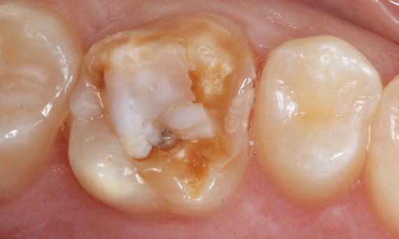 Before: First upper molar had been restored with an extensive yet insufficient composite filling that already showed visible fractures.