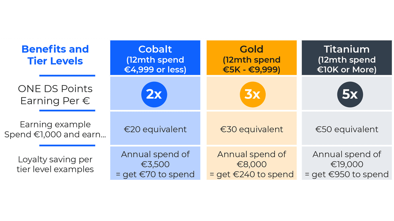 Level 1: COBALT – Up to €4,999 spent, earn 2 point per €1