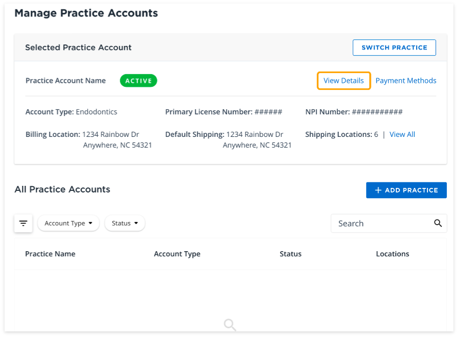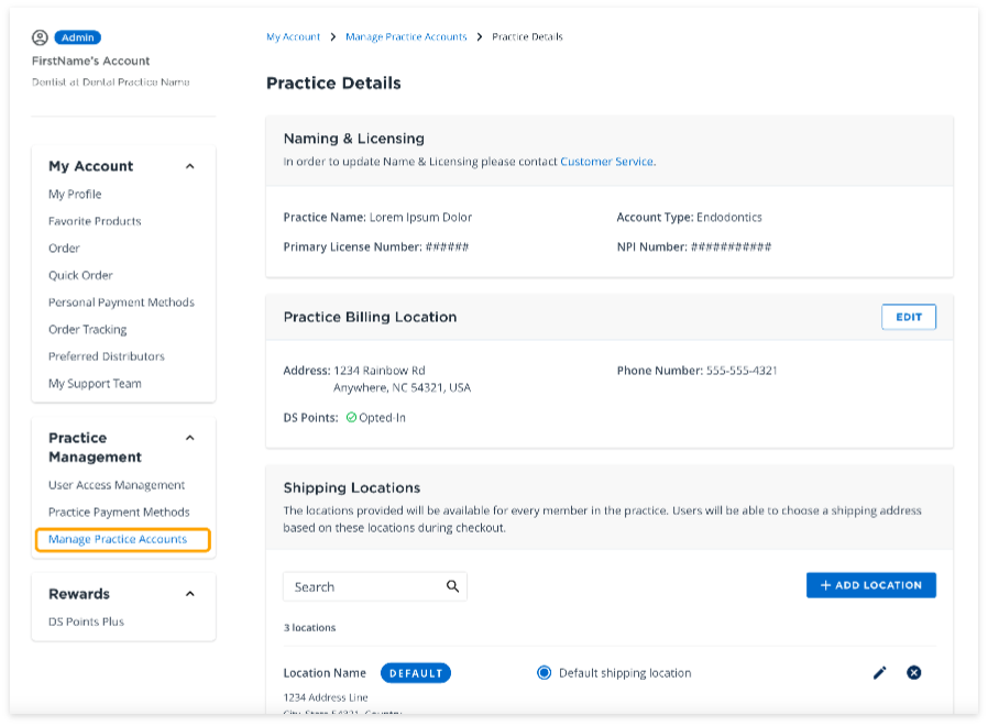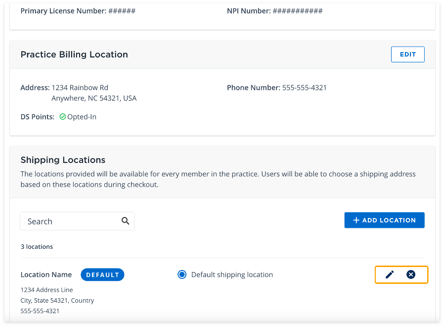 5. Scroll down the page until you reach the Shipping Locations section. Select the pencil icon to edit, X icon to remove, or Add Location to manage your practice shipping addresses