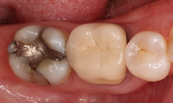 Before: First upper molar had been restored with an extensive yet insufficient composite filling that already showed visible fractures.