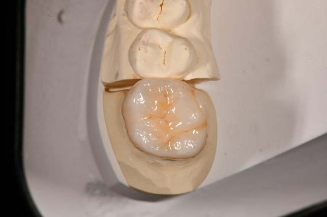 Lateral view of the finalized crown of tooth 16. Cervical part was individualized with stains.