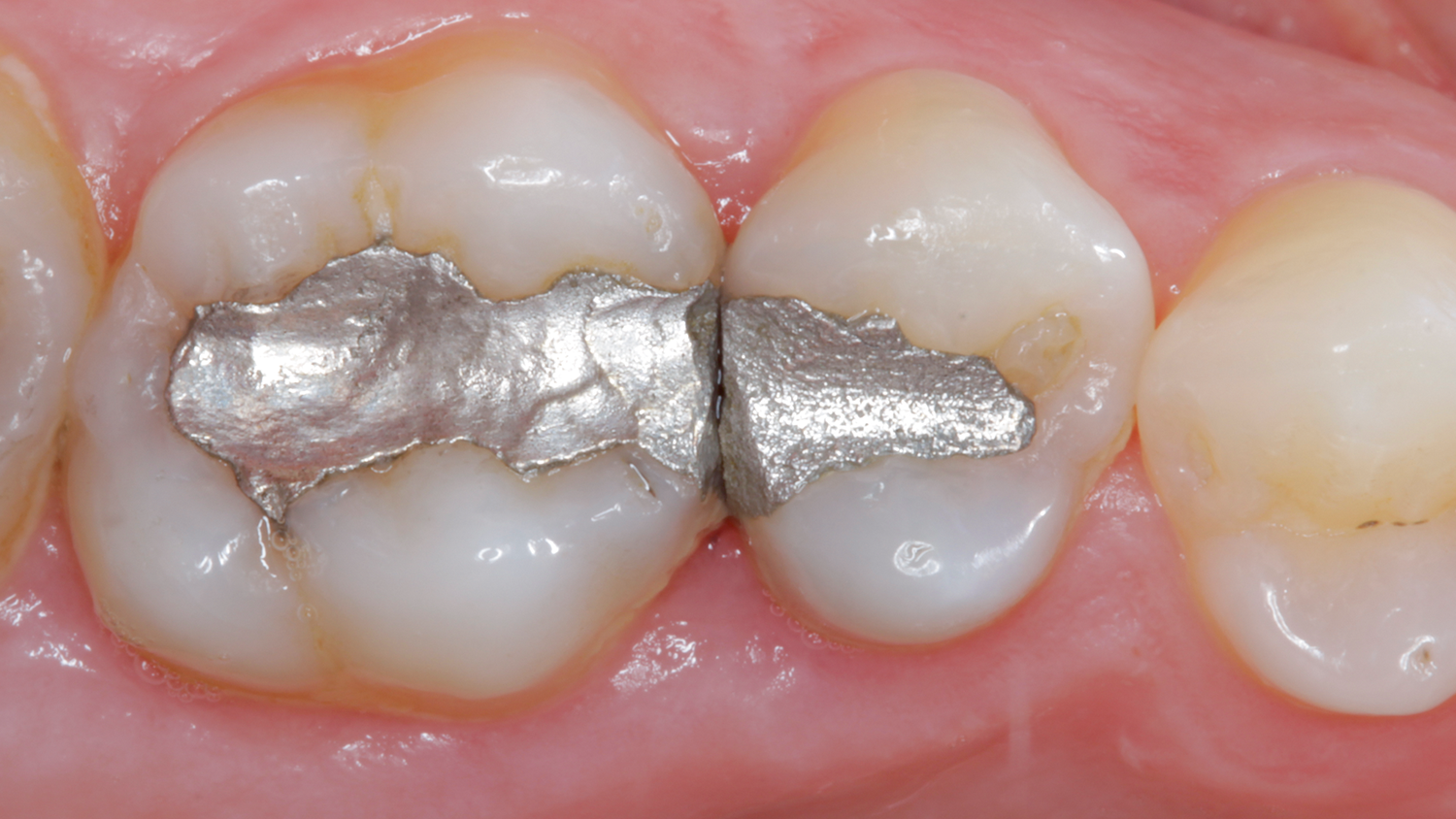 Before and after amalgam replacement showing final Ceram.x Spectra® ST universal composite restoration with excellent esthetics and gloss retention.