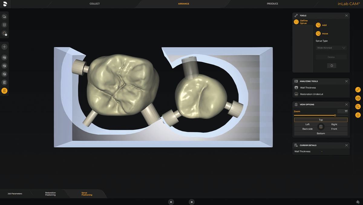 For efficient material use and optimal preparation, the inLab CAM software positions the restoration in the workpiece according to your specifications. This takes previously positioned or prepared objects into account. Users can make adjustments without restrictions in the individual arrangement – for maximum flexibility and according to individual demands.
