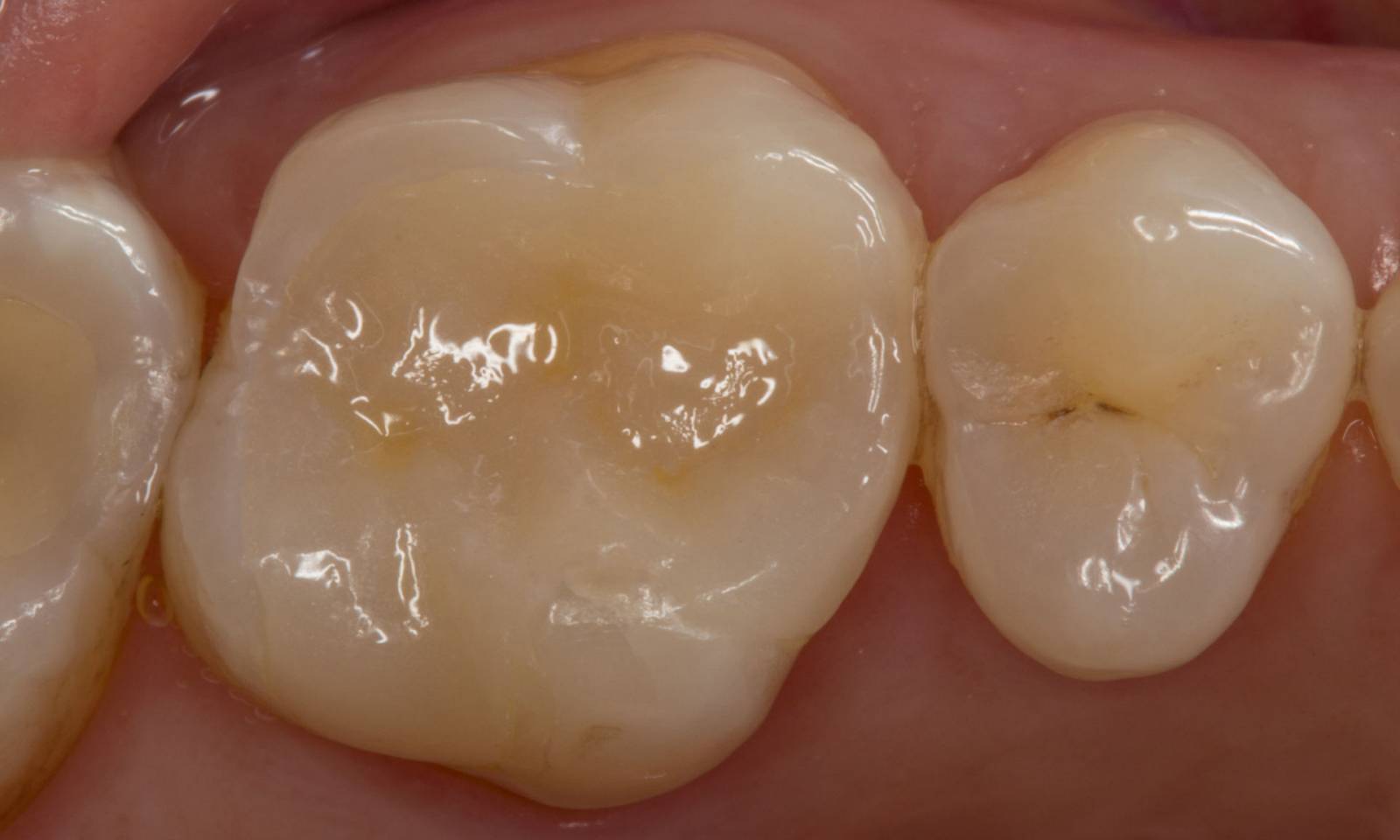First upper molar had been restored with an extensive yet insufficient composite filling that already showed visible fractures.
