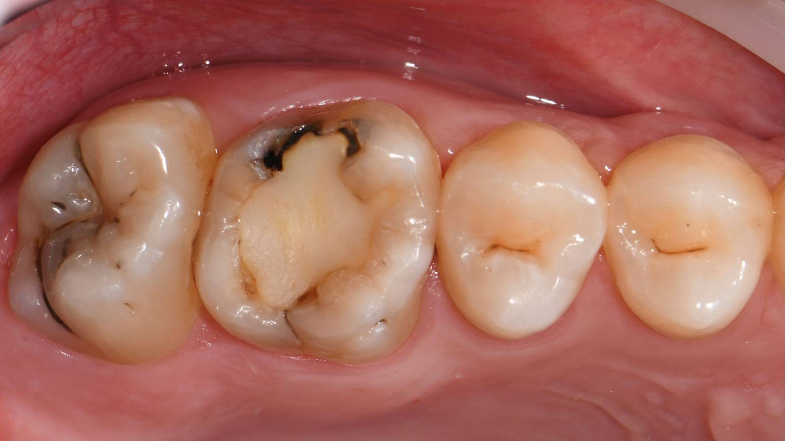 A large carious mesial lesion on tooth 15. The tooth showed asymptomatic apical periodontitis and a significant loss of tooth structure.