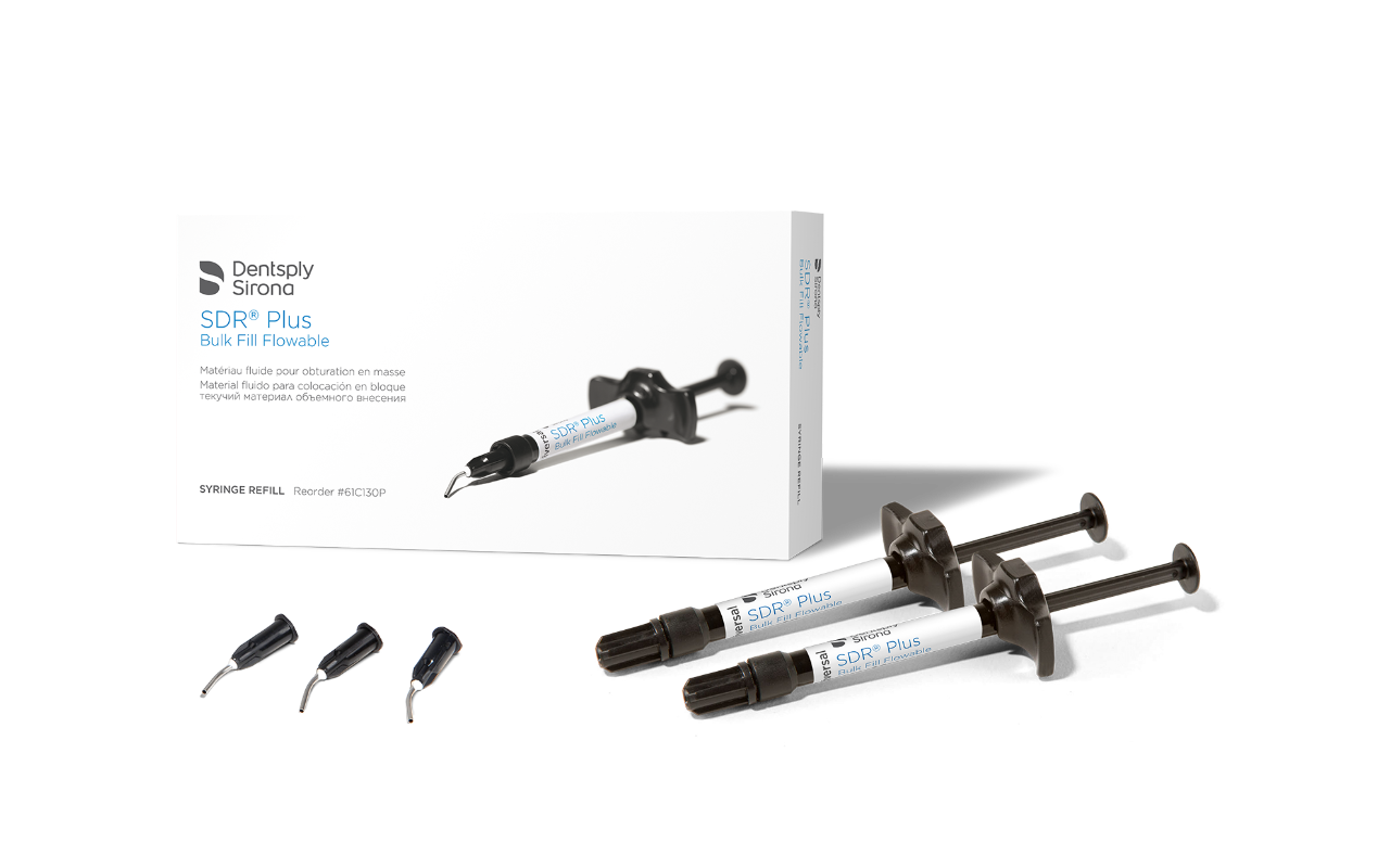 SDR® Bulk Fill Flowable Composite is a one-component, fluoride-containing, visible light cured, radiopaque composite. SDR® Bulk Fill Flowable Composite has handling characteristics typical of a flowable composite, however, can be placed in 4 mm increments with minimal polymerization stress. SDR® Bulk Fill Flowable Composite has a self-leveling feature that allows intimate adaptation to the prepared cavity walls.