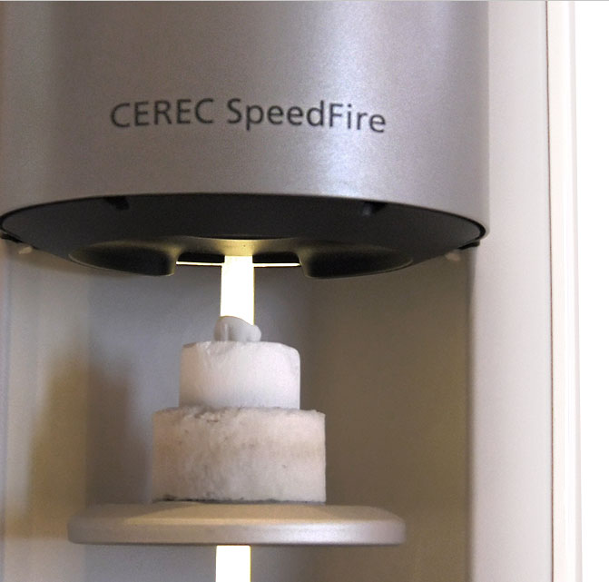 The induction furnace CEREC SpeedFire by Dentsply Sirona combines the processes of sintering and glazing in one compact, user-friendly device. The CEREC SpeedFire reaches a maximum heating rate of 300 °C per minute – no preheating or holding temperatures are necessary. Its induction technology ensures a perfectly homogeneous temperature distribution. Its dimensions make the CEREC SpeedFire a compact device that fits in any practice.
