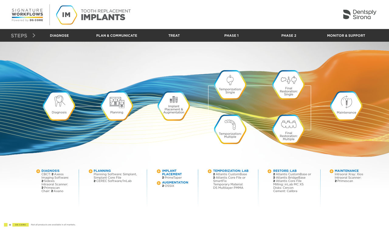 To meet your evolving needs, increase clinical efficiency and help you provide an unparalleled experience and outcome, we have united our implant procedures and products into a streamlined workflow. Dentsply Sirona is excited to bring you our Implants Signature Workflow powered by DS Core—our advanced, comprehensive, cloud-based open platform.