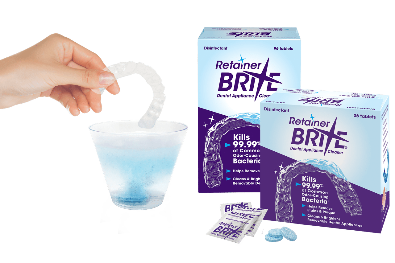 Retainer Brite® Dental Appliance Cleaner is specially formulated to help protect removable appliances by helping remove stains and plaque, killing common odor-causing bacteria* and preserving clarity and cleanliness of the appliance. Safe for cleaning dental appliances such as clear aligners, clear retainers, wire retainers, dentures, mouthguards, nightguards, bruxing and TMJ appliances.