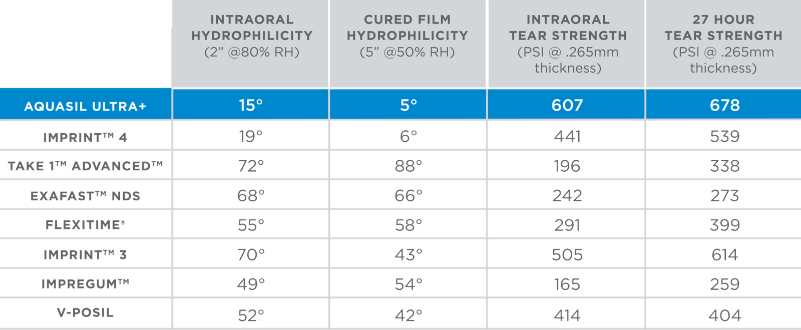Hydrophilicity, or contact angle, is most important when the material is being dispensed intraorally. Aquasil Ultra+ impression material delivers industry-leading intraoral hydrophilicity. Our extremely low contact angle—while the impression material is uncured—helps ensure an accurate impression in the presence of natural hydration, so over desiccation of the tooth prep isn’t necessary.