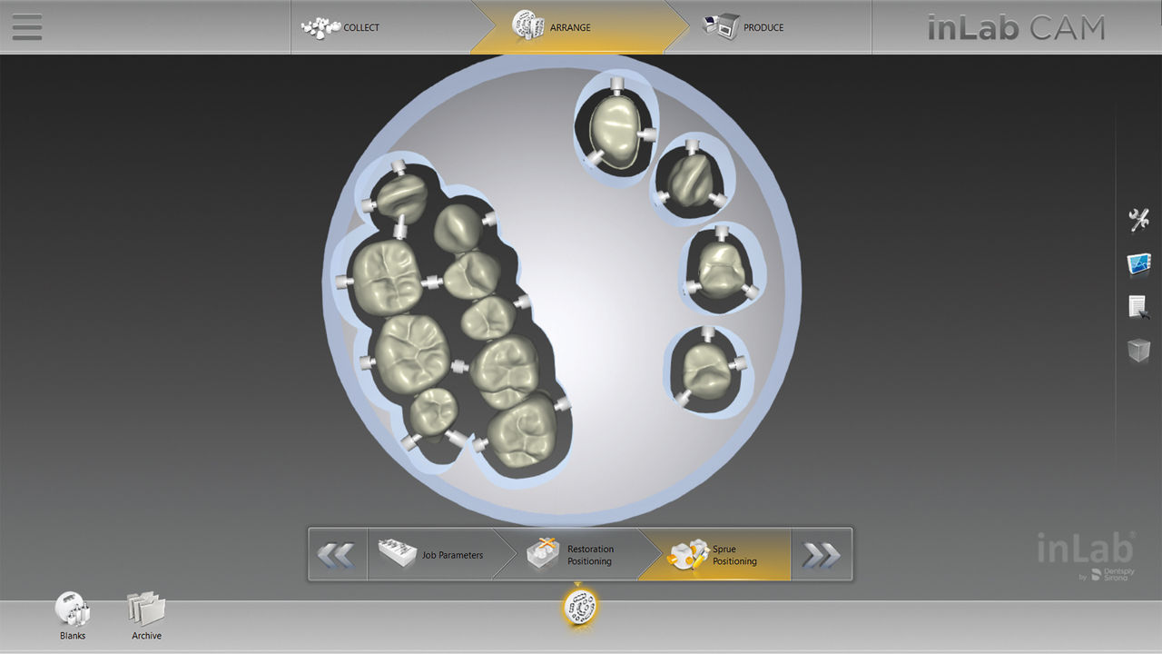 inLab SW 20.0: Parte de la biblioteca de materiales y la herramienta de posicionamiento. Escaneo mediante códigos QR.