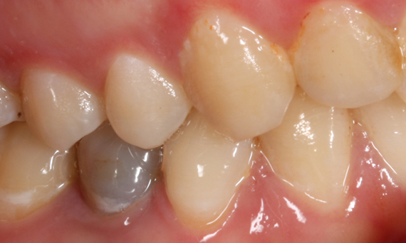 Antes: Gran insuficiencia del empaste de composite en el diente 16 con grietas en el reborde marginal distal, una grieta en la pared lingual y caries distal recurrente.