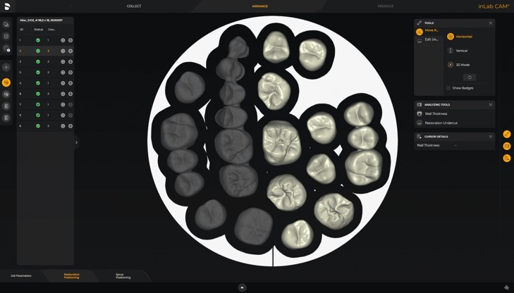 Para un uso eficiente del material y una preparación óptima, el software inLab CAM coloca la restauración en la pieza de trabajo de acuerdo con sus especificaciones. Esto tiene en cuenta los objetos previamente posicionados o preparados. Los usuarios pueden realizar ajustes sin restricciones en el acuerdo individual, para máxima flexibilidad y de acuerdo con las demandas individuales.
