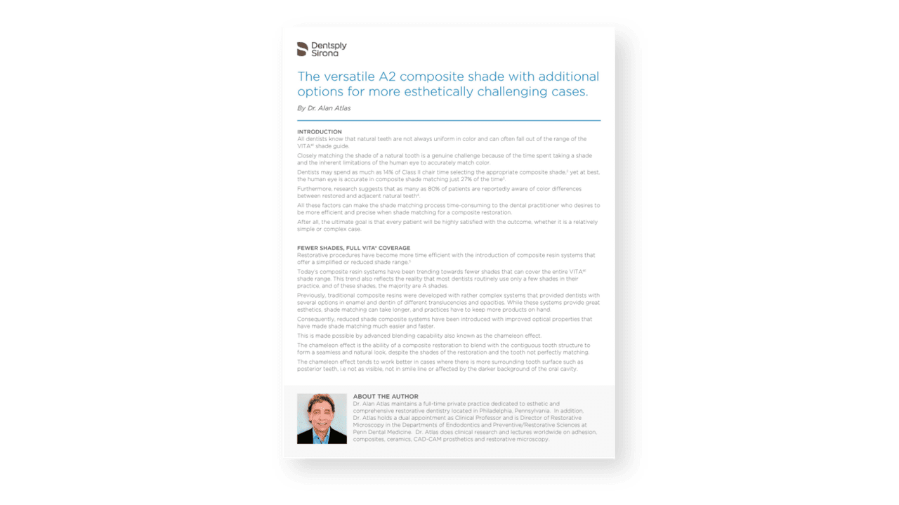 Gracias a la tecnología de relleno SphereTEC®, el composite Neo Spectra® ST ofrece características de manejo optimizadas en una viscosidad alta y baja para adaptarse a su preferencia y técnica para eficiencia de colocación. El relleno SphereTEC® ofrece una capacidad mejorada de mezcla camaleónica al composite Neo Spectra® ST para una combinación simplificada de colores. También permite un acabado rápido y se pule para lograr un excelente brillo.