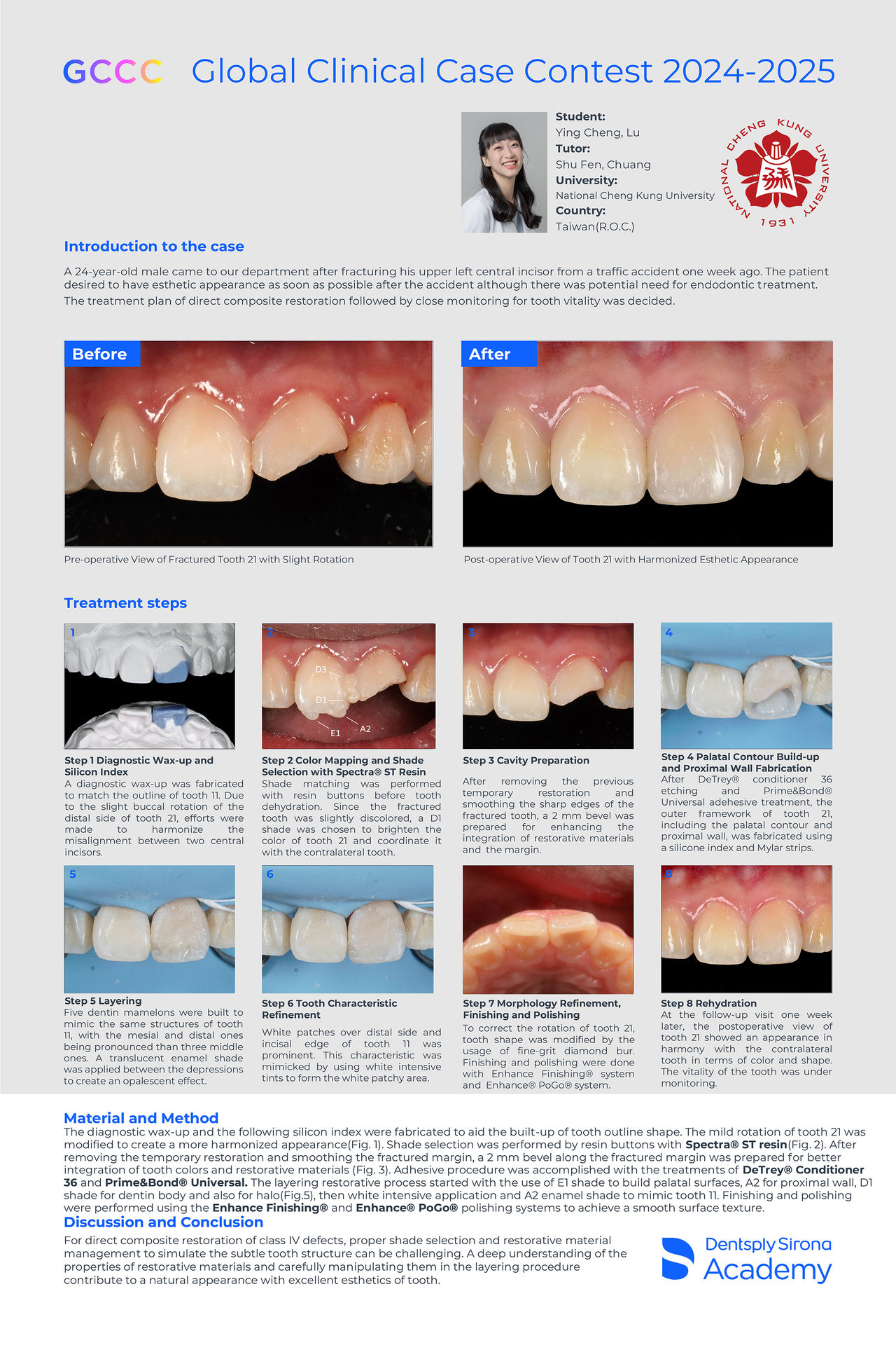 Clinical anterior or posterior restorations are placed using the entire Dentsply Sirona restorative product line. All entries must be submitted electronically, photo documented and accompanied by text, and submitted in a standardized format provided by Dentsply Sirona. All Dentsply Sirona products, required for fabricating cases, are available free of charge to participants. Direct as well as indirect restorations created chairside using the CAD/CAM workflow are eligible for entering the contest. It is allowed to treat several teeth.