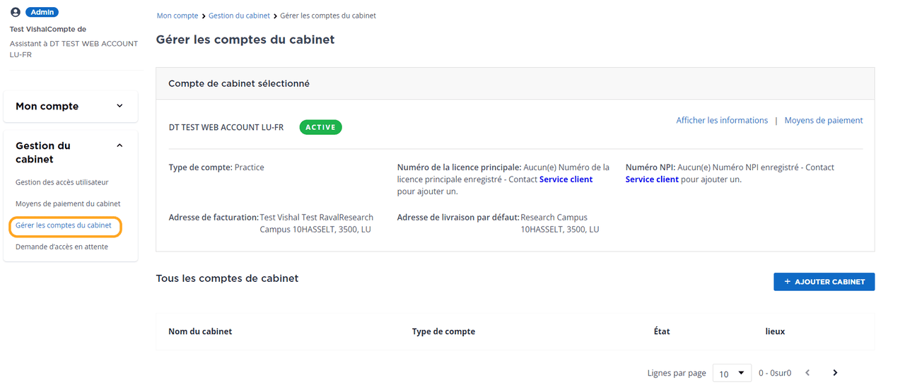 3. Sélectionnez Gestion du cabinet dans le menu de gauche, puis Gérer les comptes du cabinet dans le menu déroulant