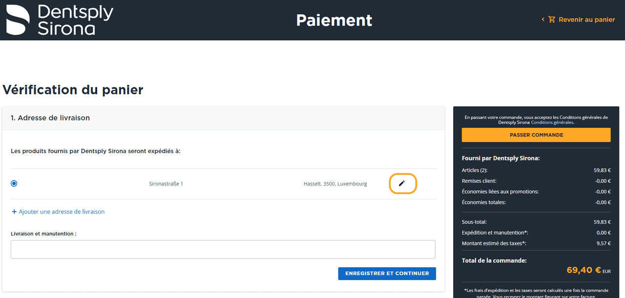 1. Sous Adresse de livraison, sélectionnez l’adresse que vous souhaitez modifier, puis sélectionnez l’icône de crayon à droite de l’adresse