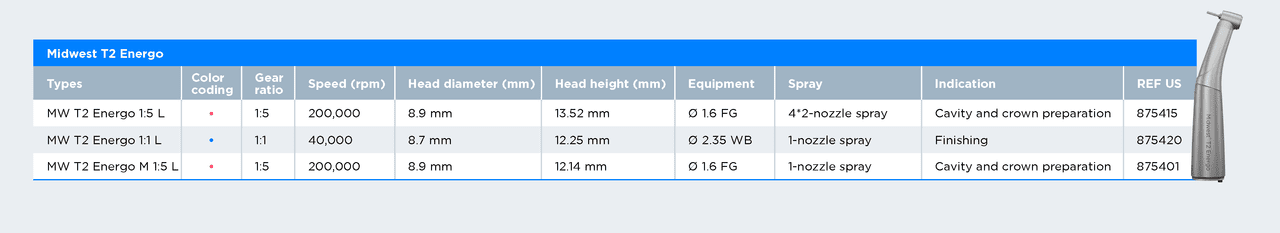 Découvrez la Midwest T2 Energo de Dentsply Sirona, une série de pièces à main électriques robustes de la catégorie confort qui allie qualité et expertise. L’interface ISO vous permet de rester flexible et l’éclairage optimisé garantit l’une des meilleures vues. Les pièces à main de la catégorie T2 impressionnent par leur qualité estampillée « fabriquée en Allemagne », leur conception optimisée des engrenages et leur technologie Safe Head1. La durabilité et l’ergonomie sont soutenues par le système de pulvérisation à 4*2 buses. Faites confiance à la Midwest T2 Energo pour d’excellentes performances dans votre cabinet dentaire.