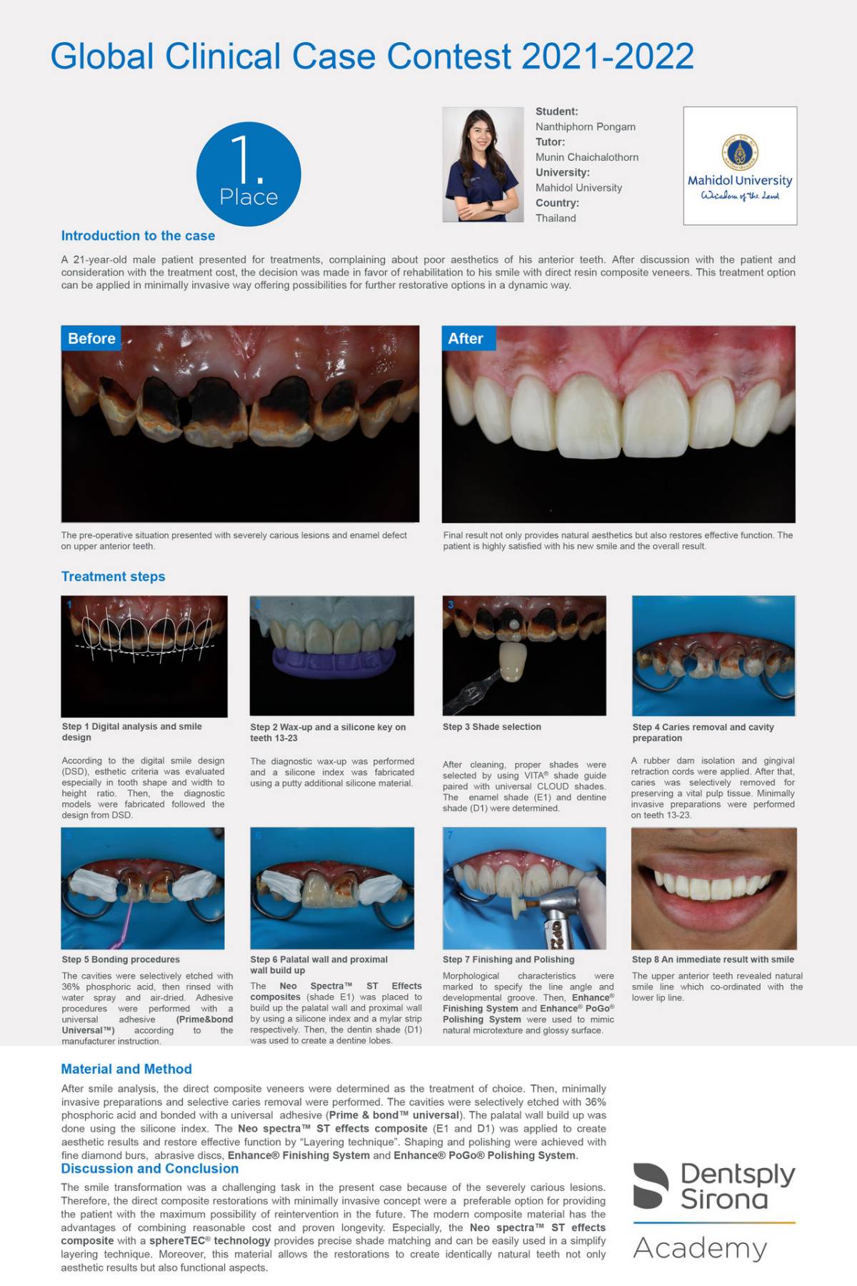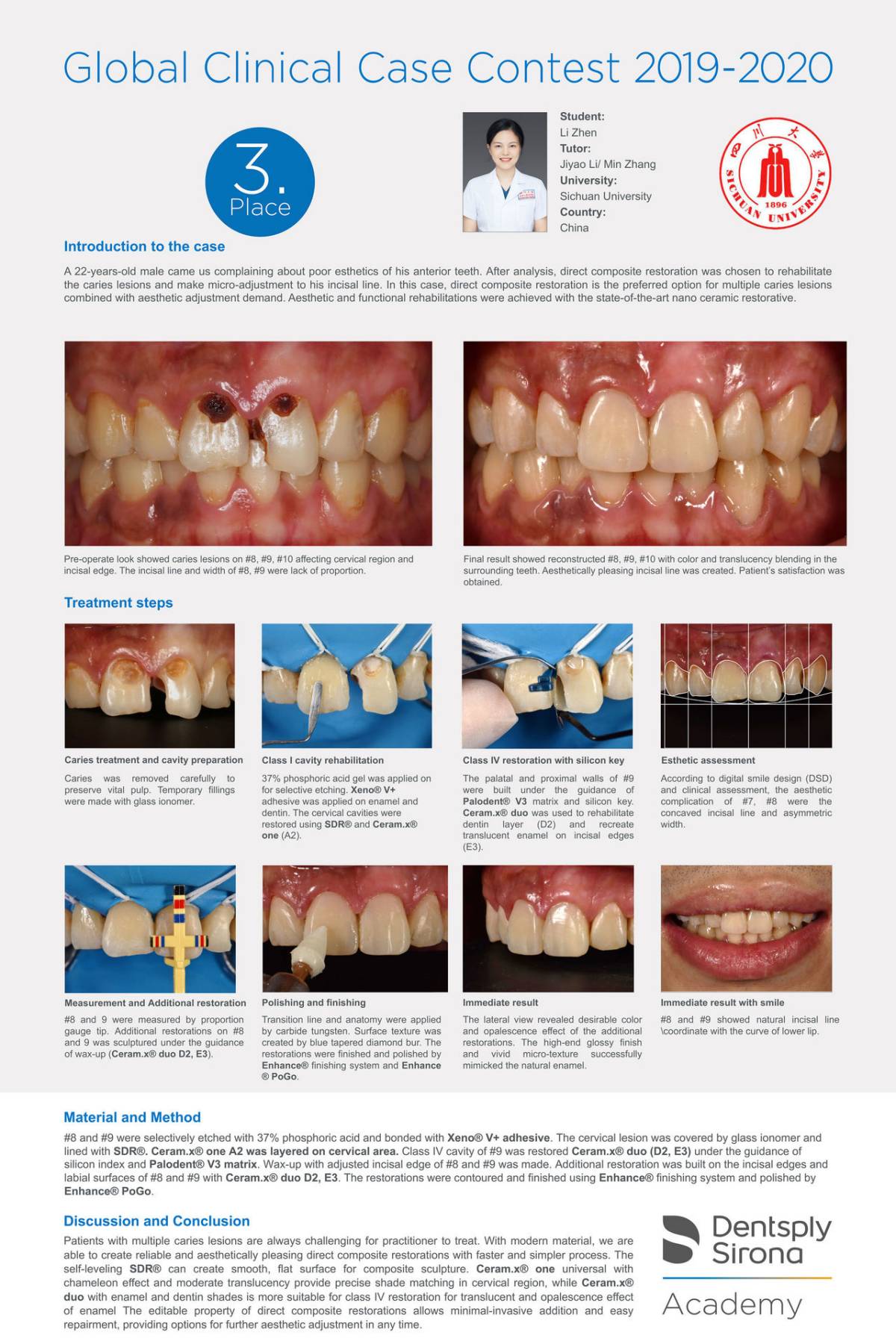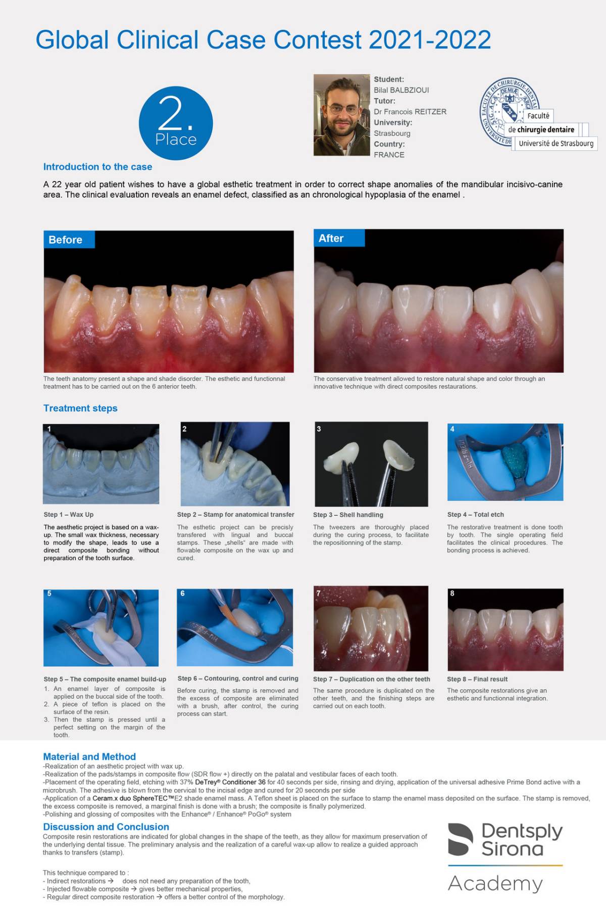 La finale du concours mondial de cas cliniques Dentsply Sirona a été diffusée en direct sur le Web le 24 juin 2021. 390 étudiants ont travaillé dur pour réaliser des traitements cliniques esthétiques avec la gamme de produits Dentsply Sirona. Regardez le résumé vidéo de nos 13 finalistes qui ont présenté leurs cas cliniques impressionnants devant notre jury pour déterminer les trois premiers lauréats mondiaux.