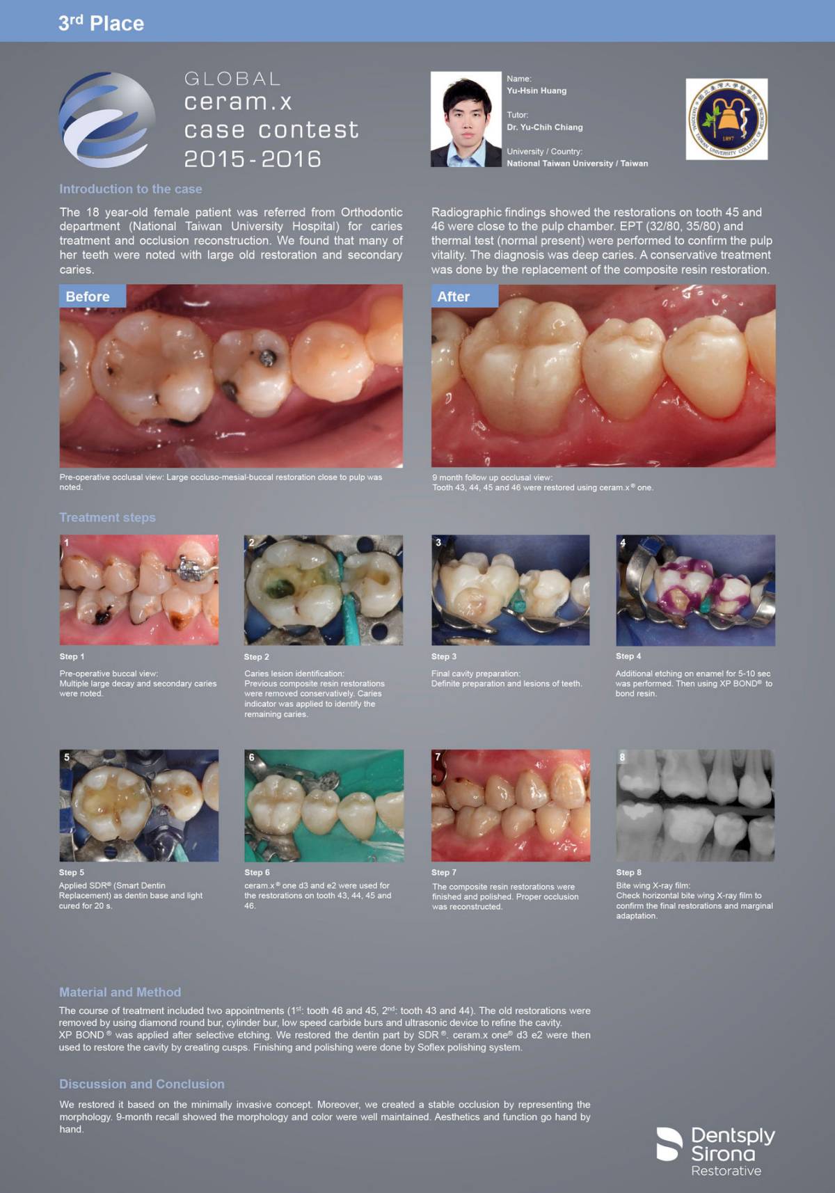 Les restaurations cliniques antérieures ou postérieures seront réalisées à l’aide de la gamme complète de produits de restauration Dentsply Sirona. Le cas doit être soumis par voie électronique, documenté par une photo et accompagné d’un texte, et soumis dans un format standardisé fourni par Dentsply Sirona. Tous les produits Dentsply Sirona nécessaires à l’élaboration des cas seront mis gratuitement à la disposition des participants. Les restaurations directes et indirectes créées au fauteuil à l’aide du flux de travail CAO/FAO sont admissibles à ce concours. Il est permis de traiter plusieurs dents.