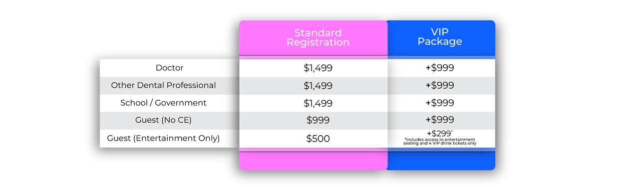 Professionnels de la santé dentaire : L’entrée comprend l’accès aux séances générales, aux formations, à la salle d’exposition, aux repas et aux réceptions dans la salle d’exposition, suivis de divertissements en soirée le jeudi et le vendredi (d’une valeur de 500 $).
