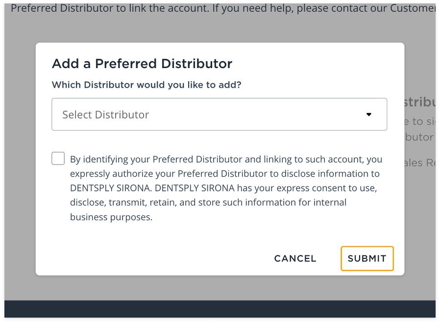5. Select Submit to open the distributor’s website in a new window. You’ll need to enter your credentials for the distributor’s website to connect that account to your DentsplySirona.com account You must have a valid distributor web account to login. If you do not have an existing distributor web account, register on the distributor’s website If you experience issues during this process, please reach out to your distributor’s customer service department
