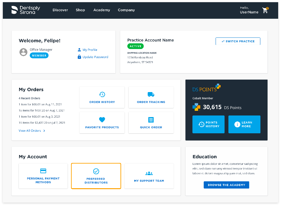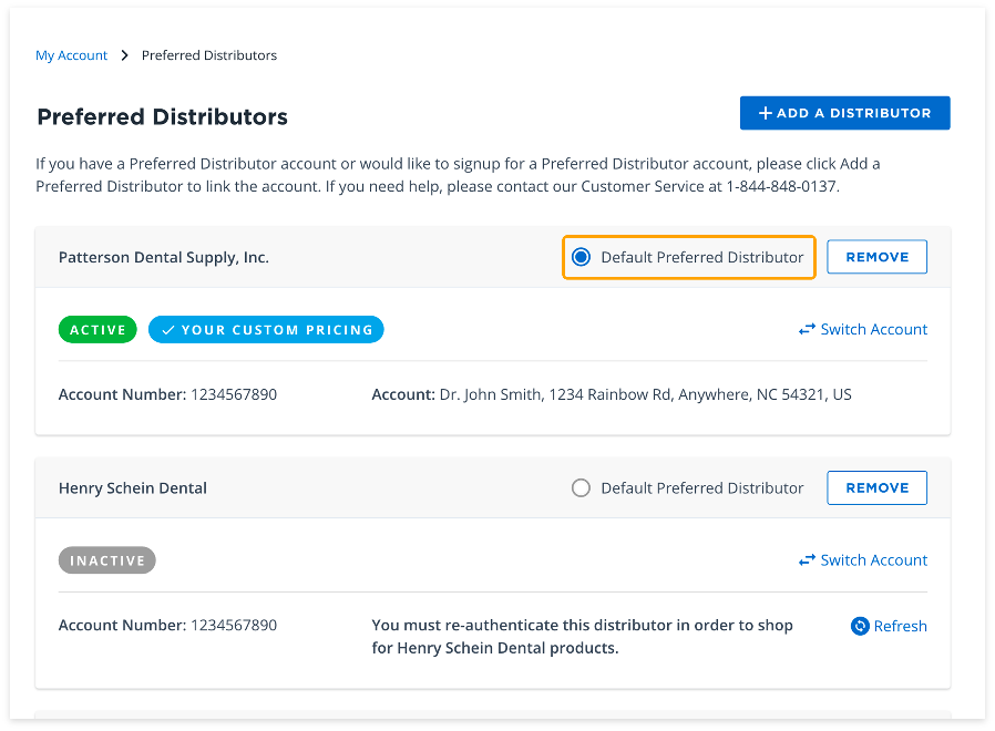 You can link more than one distributor to your DentsplySirona.com account, but can only purchase through one distributor at a time. If you’d like to change a preferred distributor in your DentsplySirona.com account, follow these directions: