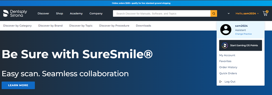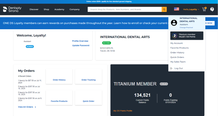Lorsque vous vous connectez à dentsplysirona.com, le total de vos points DS s’affiche en cliquant sur le menu Bienvenue dans le coin supérieur droit du site Web, ou si vous naviguez jusqu’à l’écran principal Mon compte.