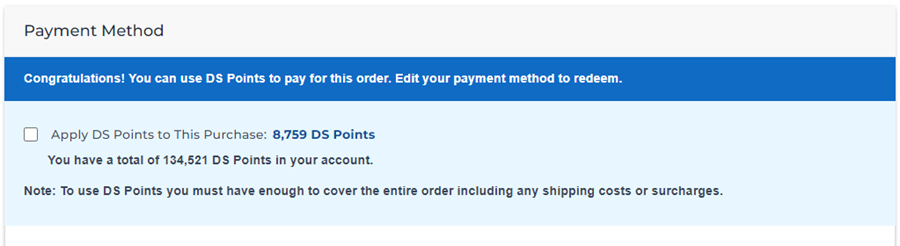 Lors de la validation de votre commande, si votre solde de points DS couvre le montant total, un message apparaîtra dans la section Méthode de paiement, vous informant que vous pouvez utiliser vos points pour régler votre commande.