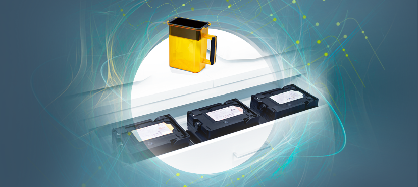 Pour des indications spécifiques, Primeprint utilise un matériau distinct. Les cartouches sont dotées d’un code couleur, pour une manipulation facile et sans contact ainsi qu’un fonctionnement intuitif. Primeprint offre également une protection complète contre la lumière UV. Grâce à l’étiquette RFID, Primeprint vérifie automatiquement la cartouche insérée et le niveau de remplissage.