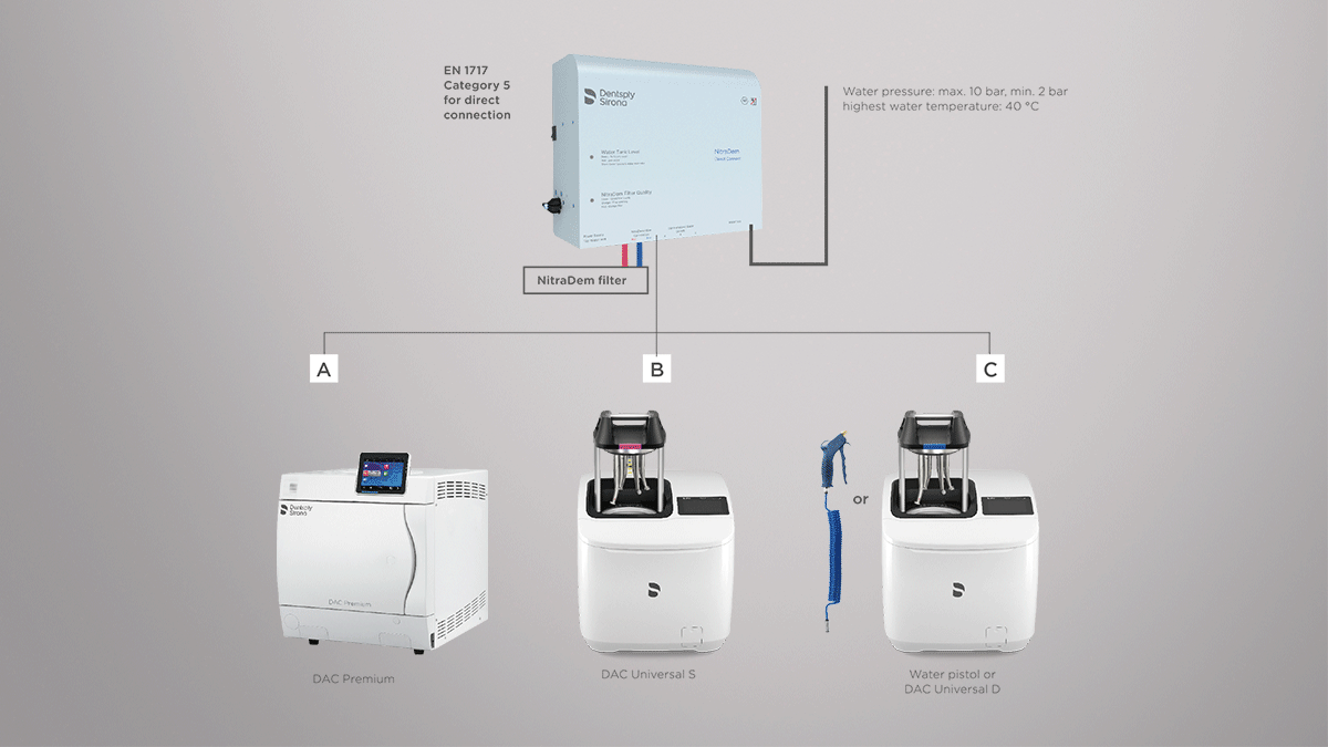 Le système NitraDem Direct Connect 2 fournit de l’eau déminéralisée de haute qualité au DAC Universal D et à tout autre autoclave à un coût réduit. Ce système de traitement de l’eau hautement efficace fonctionne de façon complètement automatique conformément à la norme européenne EN 1717-5, en permettant un raccordement direct entre l’alimentation en eau et les autoclaves tels que le DAC Universal. Le NitraDem Direct Connect 2 peut alimenter en eau purifiée jusqu'à trois machines, l’une d’entre elles pouvant être équipée d'une pompe d'aspiration intégrée, telles que le DAC Professional ou le DAC Premium Plus E.