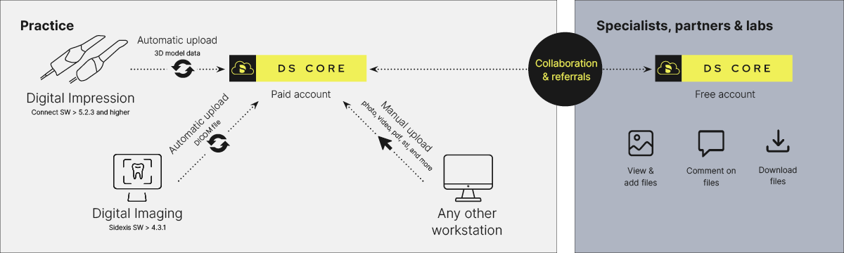 C’è altro: Puoi estendere la collaborazione con il tuo laboratorio partner e i tuoi colleghi e trarre vantaggio da una maggiore efficienza attraverso DS ]Core, una soluzione di archiviazione e condivisione cloud conforme alle normative.